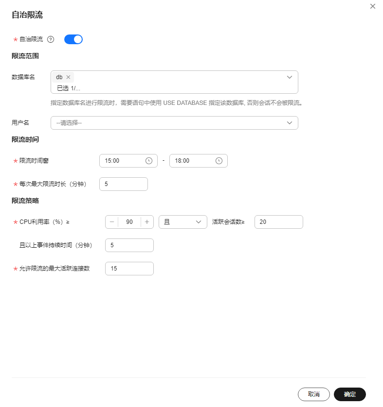 例如:实例的cpu利用率在90%以上并且活跃会话数在1000以上,该事件持续30分钟才会触发自治限流。