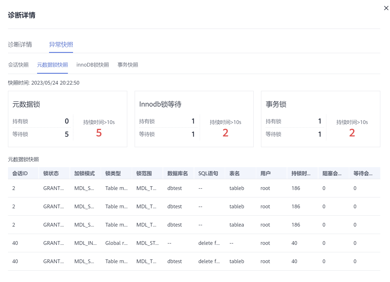 - 您可以在“异常快照”页面,查看当前实例的异常快照的会话快照、元数据锁快照、innodb锁快照、事务快照等相关信息。