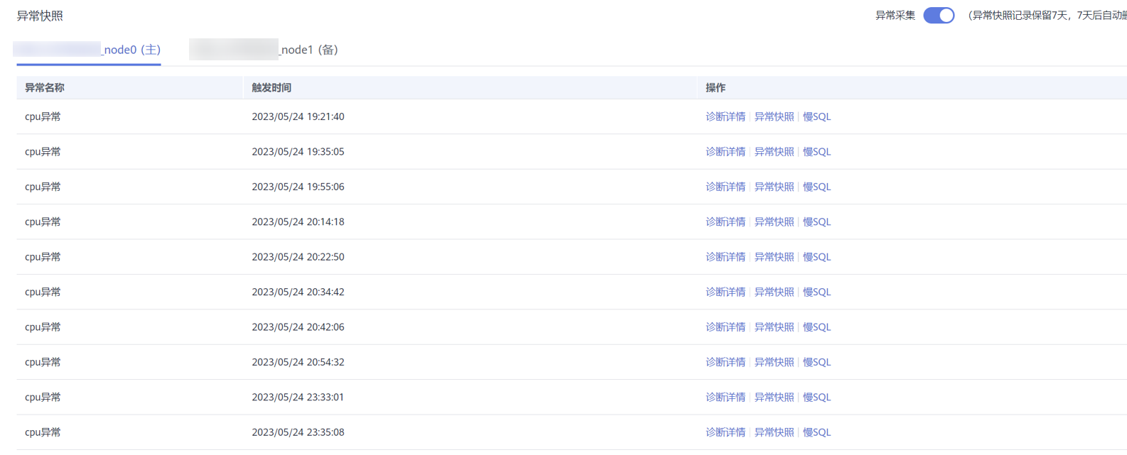 - 每个异常快照最长保留7天,每个节点的异常快照同一时间最多保存10条。