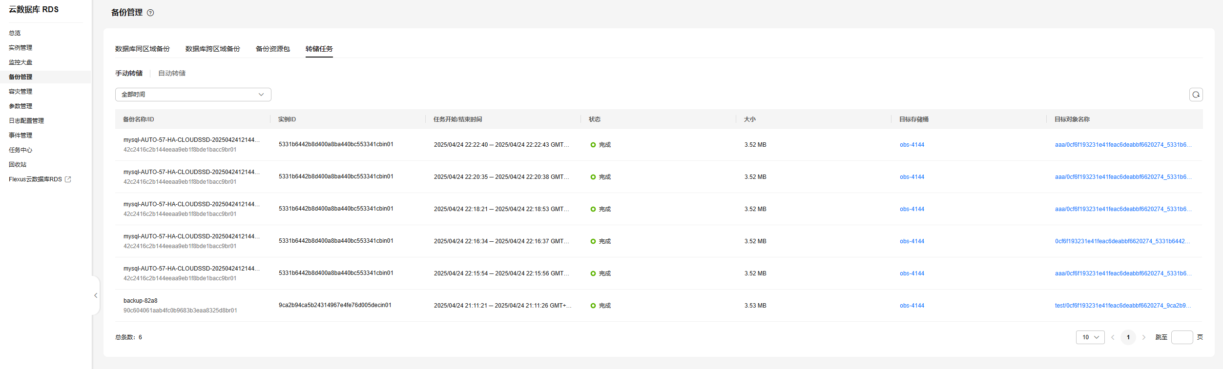 - 请保证obs目标存储桶可用并空间充足,超出空间后将导致转储任务失败。