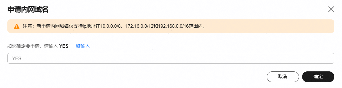 仅支持10.0.0.0/8、172.16.0.0/12和192.168.0.0/16范围内的内网ip申请内网域名。