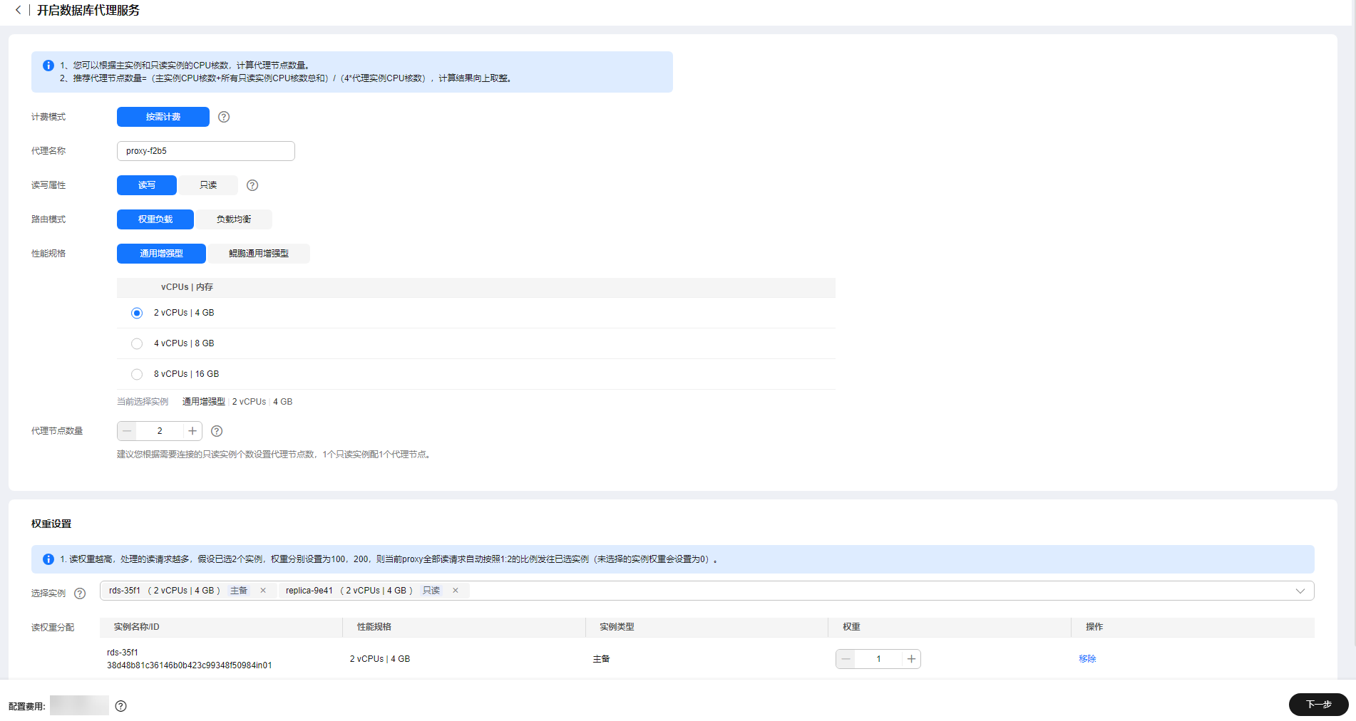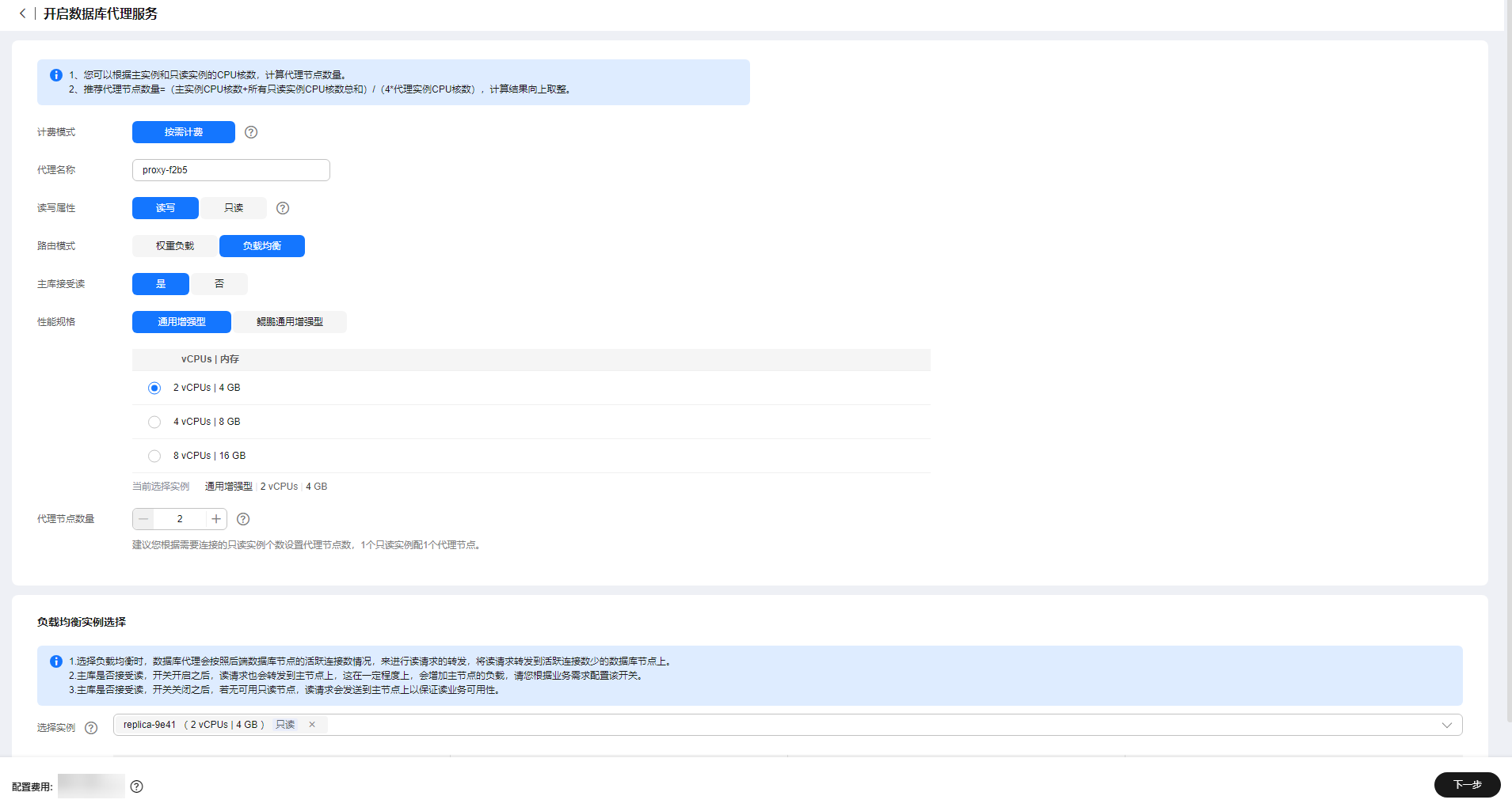 - 在开启数据库代理页面,设置以下参数,单击“下一步”。