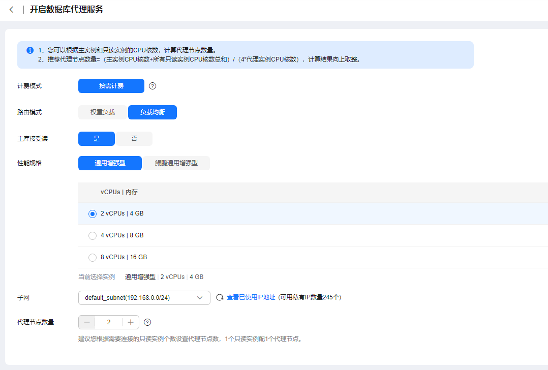 选择代理实例的规格。创建后可以根据业务需求变更规格,具体请参见变更数据库代理的规格。