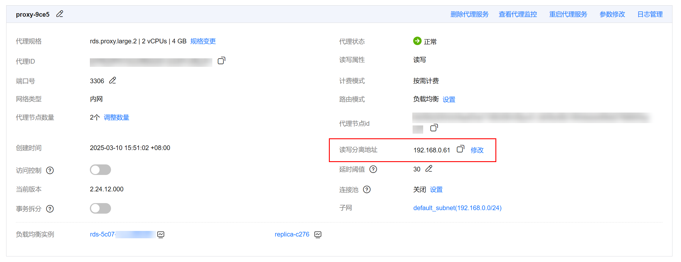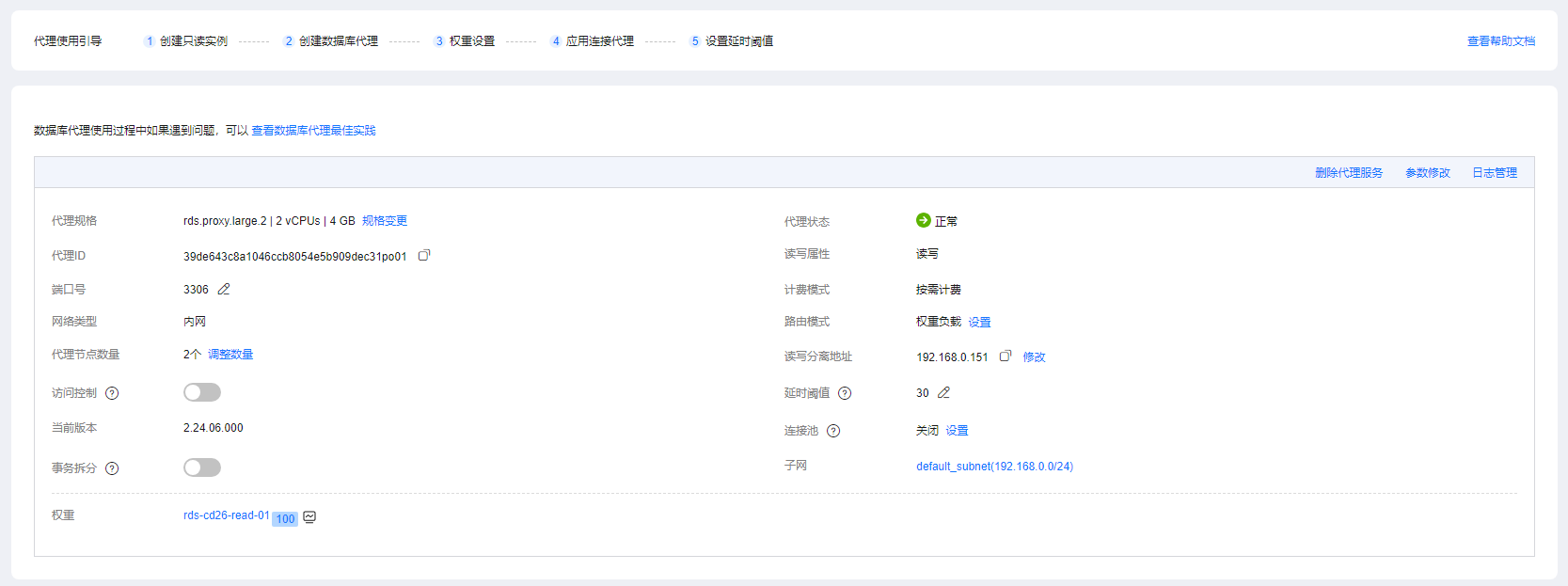 - 创建完成后,可以在“数据库代理”页面查看并管理代理服务信息。
