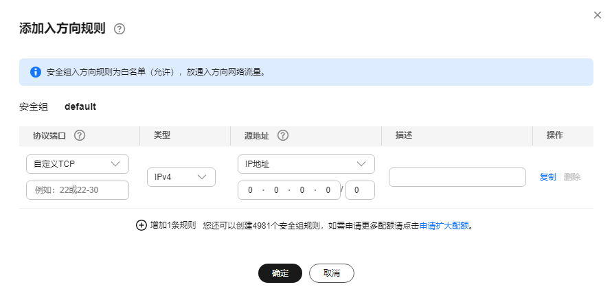 如果没有该条规则,单击“添加入方向规则”或者“一键添加”,设置安全组规则。图12 添加入方向规则