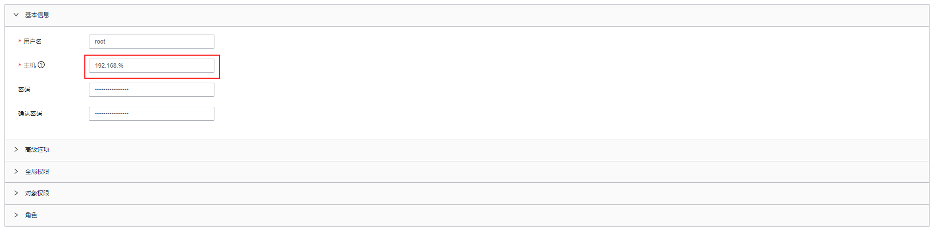 例如:使用root用户想要从192.168.0网段连接到rds for mysql实例,您可以在das用户管理界面将当前账号的主机设置为192.168.%。具体操作请参见。