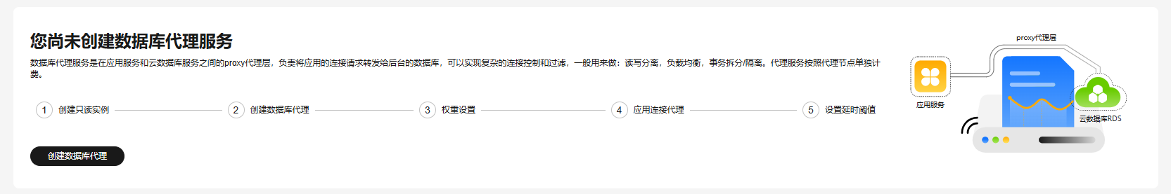 创建rds for mysql实例后,您可以开通数据库代理,通过代理地址实现读写请求的自动转发。写请求自动访问主节点,读请求按照数据库代理的路由模式分发到各个节点,降低主节点的负载。