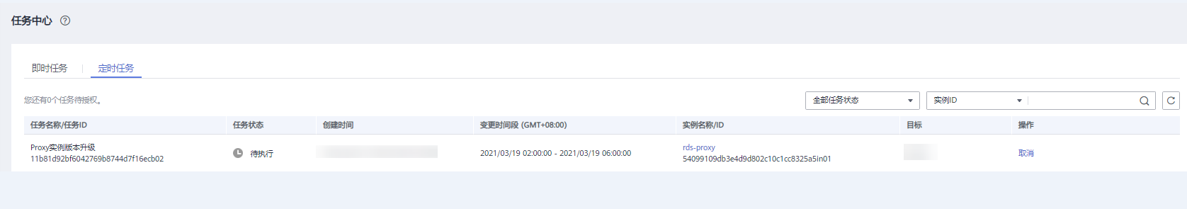 - 可维护时间段内升级:系统会在您设置的可维护时间段内,升级您的数据库代理内核版本到当前最新版本,可通过查看升级任务及任务状态。