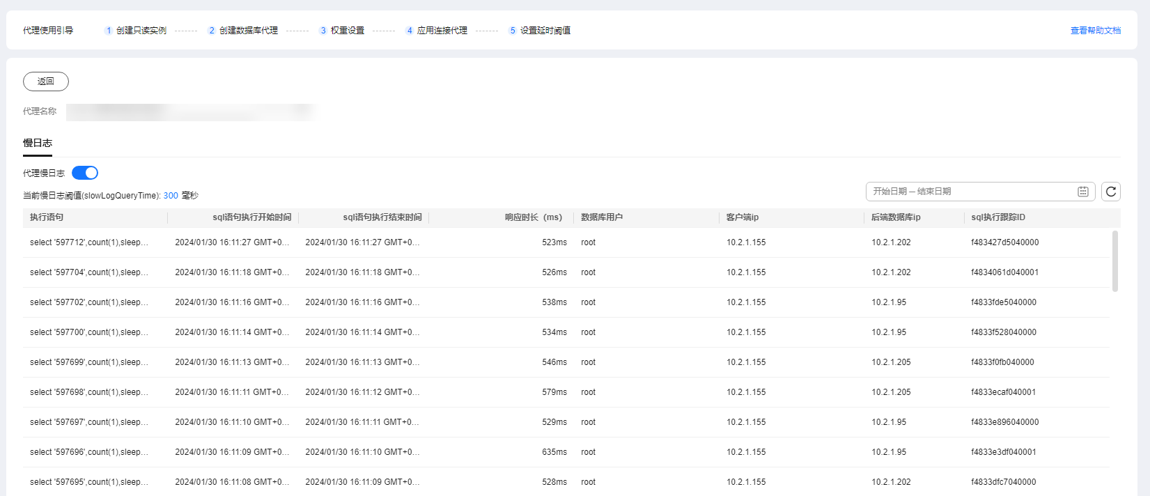 ,开启代理慢日志采集。 - 在“慢日志”页签下,选择时间范围,查看慢sql语句的详细信息。