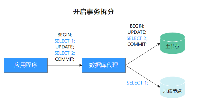 数据库代理提供事务拆分的功能,能够将事务内写操作之前的读请求转发到只读实例,降低主实例负载。