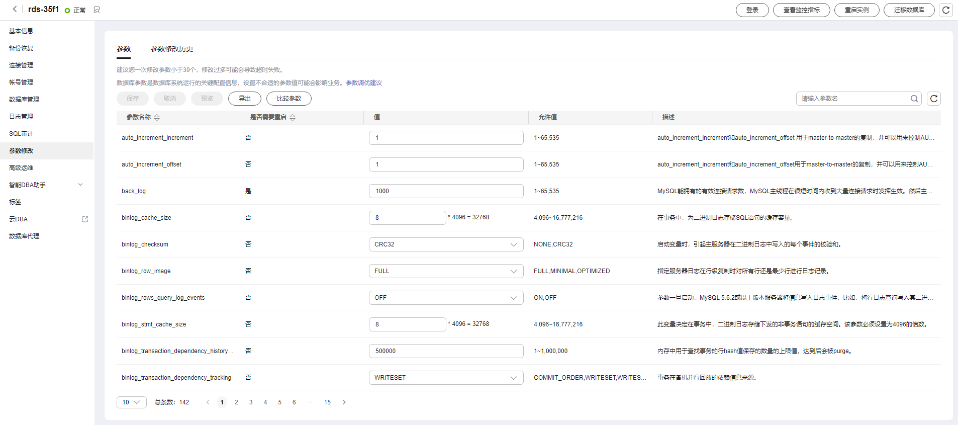 - 当您在“参数管理”页面,修改自定义参数模板时,需执行“应用”操作,才会对实例生效。当您更改静态参数并保存数据库参数模板时,参数更改将在您应用到实例后,手动重启与数据库参数模板关联的数据库实例后生效。应用参数模板到数据库实例,请参见应用参数模板。