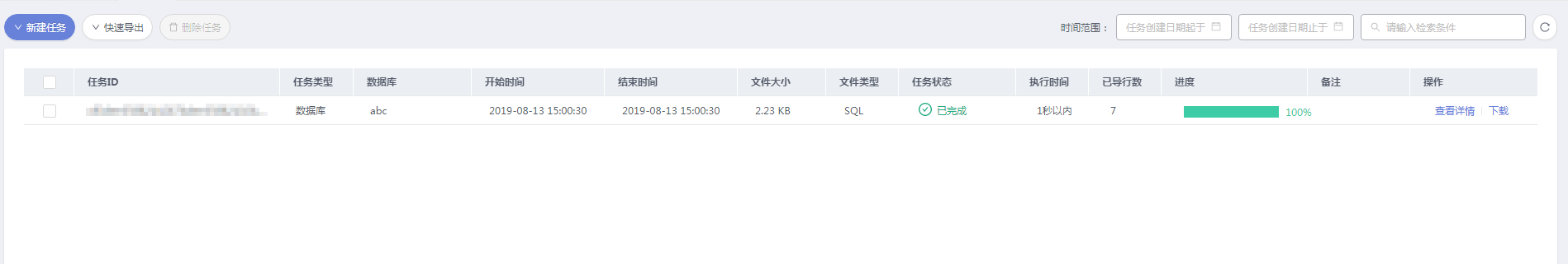 - 在导出任务列表页面,您可查看任务id、任务类型、任务状态、进度等信息。