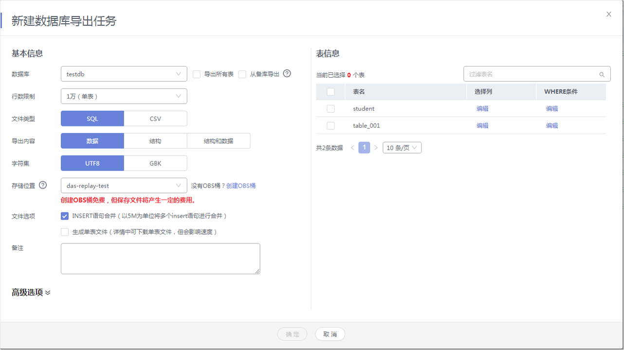 - 在导出数据库弹出页面,您可按需选填“基本信息”及“高级选项”,并在页面右侧选择需要导出的表。