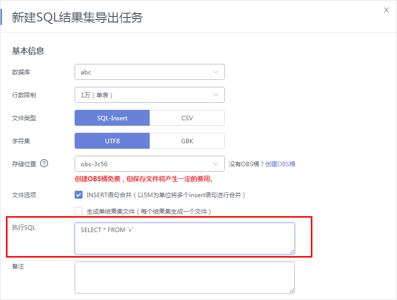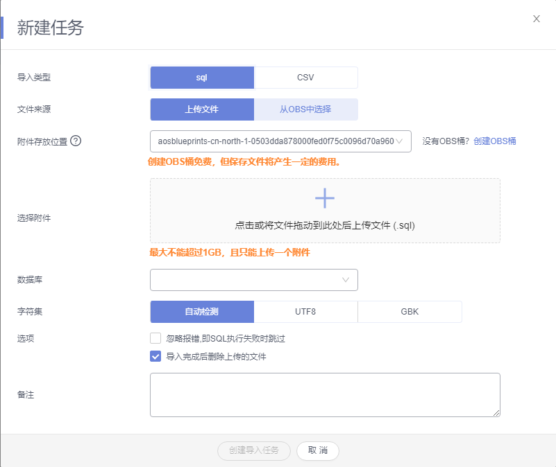 在导入页面单击左上角的“新建任务”,在弹出框设置导入类型,选择文件来源为“从obs中选择”,在obs文件浏览器弹窗中选择待导入文件,选择导入数据库,设置字符集类型,按需勾选选项设置及填写备注信息。