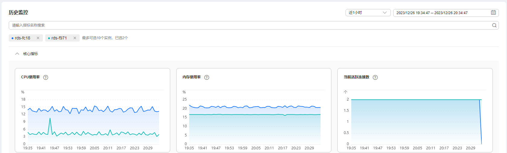 在监控列表勾选实例,单击“查看历史监控”,可以在“历史监控”模块同时查看多个实例监控指标趋势图。