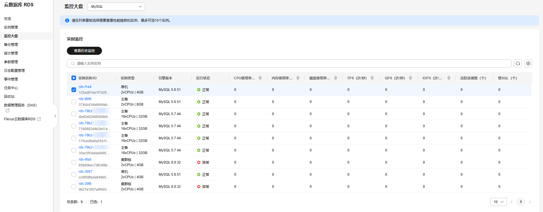 - 在“监控大盘”页面上方的下拉框,选择“mysql”,查看当前账号下,创建完成的mysql实例的实时性能指标。