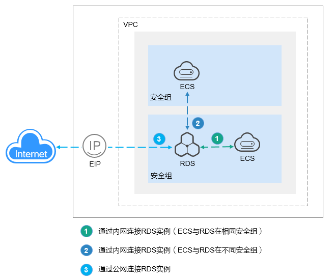 从安全组外访问安全组内的数据库实例时,需要为数据库实例所在安全组配置相应的入方向规则,详见设置安全组规则。 |