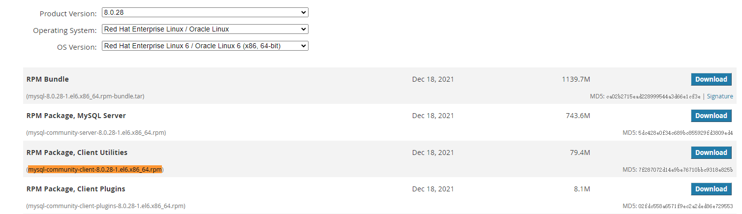 打开,以mysql-community-client-8.0.28-1.el6.x86_64.rpm为例,下载安装包。