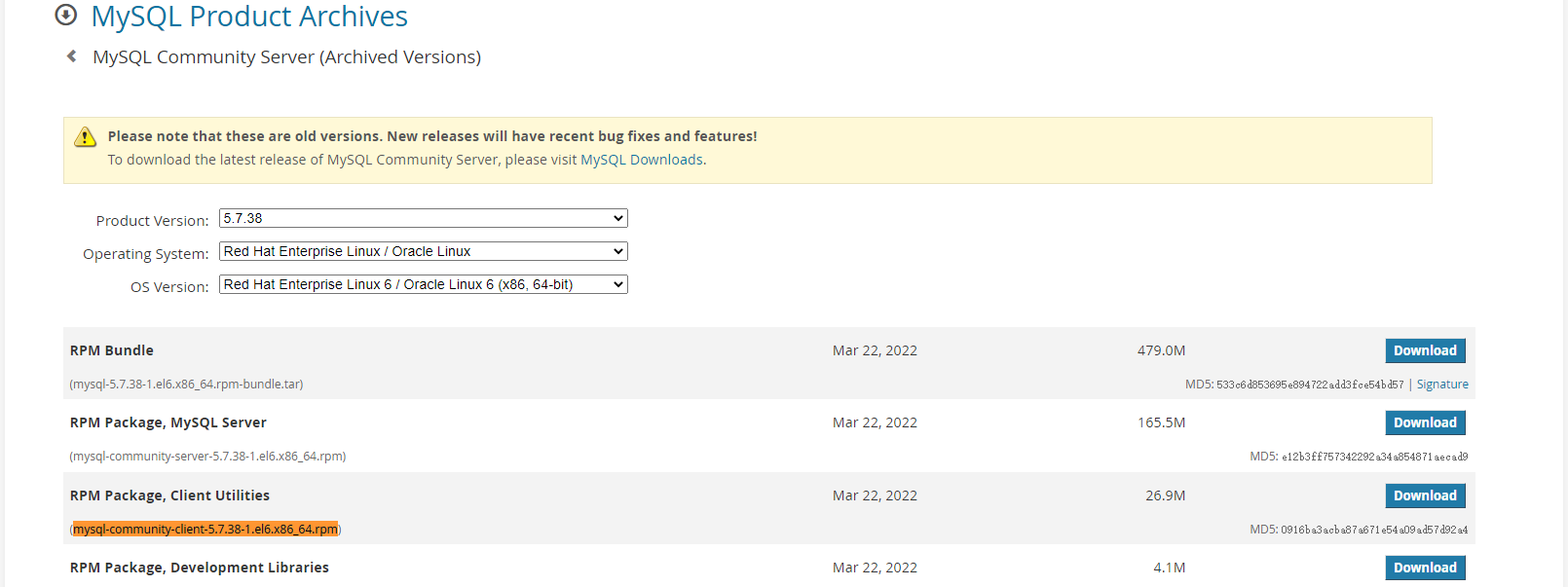 打开,以mysql-community-client-5.7.38-1.el6.x86_64.rpm为例,下载安装包。