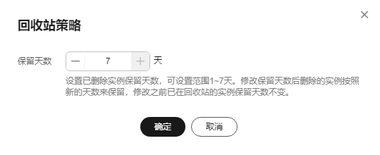 - 在“回收站”页面,单击“回收站策略”,设置已删除实例保留天数,可设置范围为1~7天。