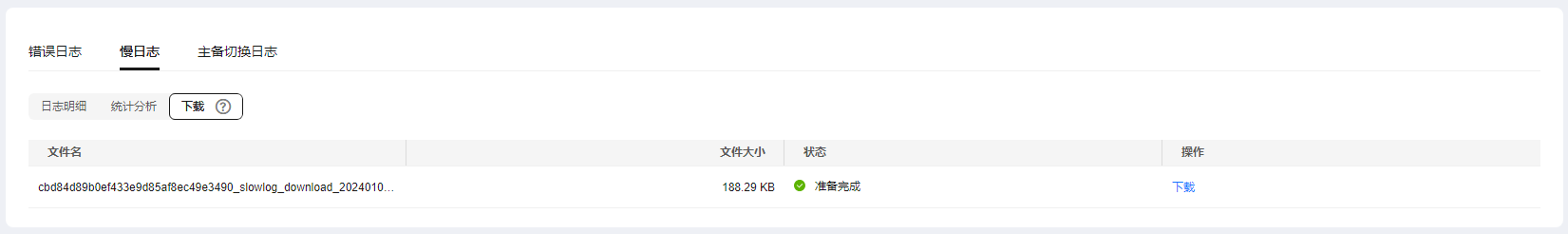 - 选择“下载”,对状态为“准备完成”的日志文件,单击操作列中的“下载”,下载慢日志。