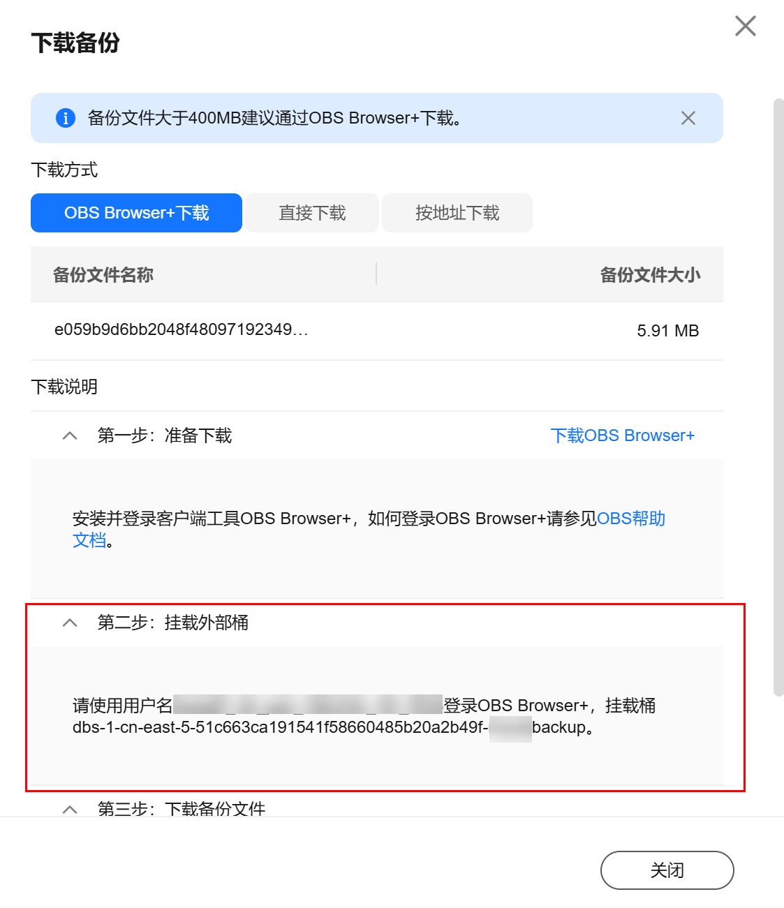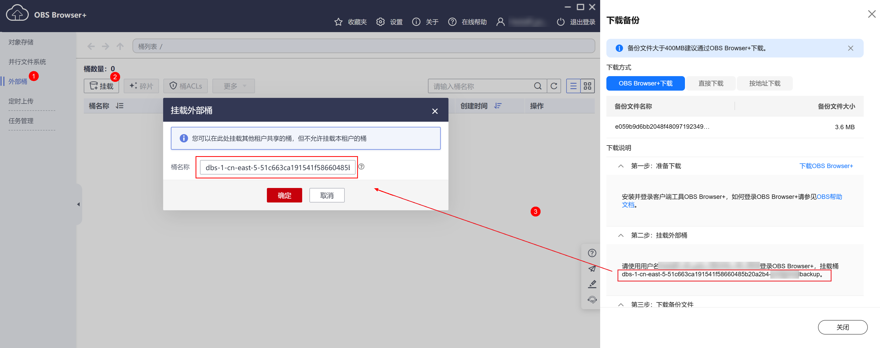 - 在当前实例的任意一个备份文件的obs browser 下载页面,获取外部桶名称。