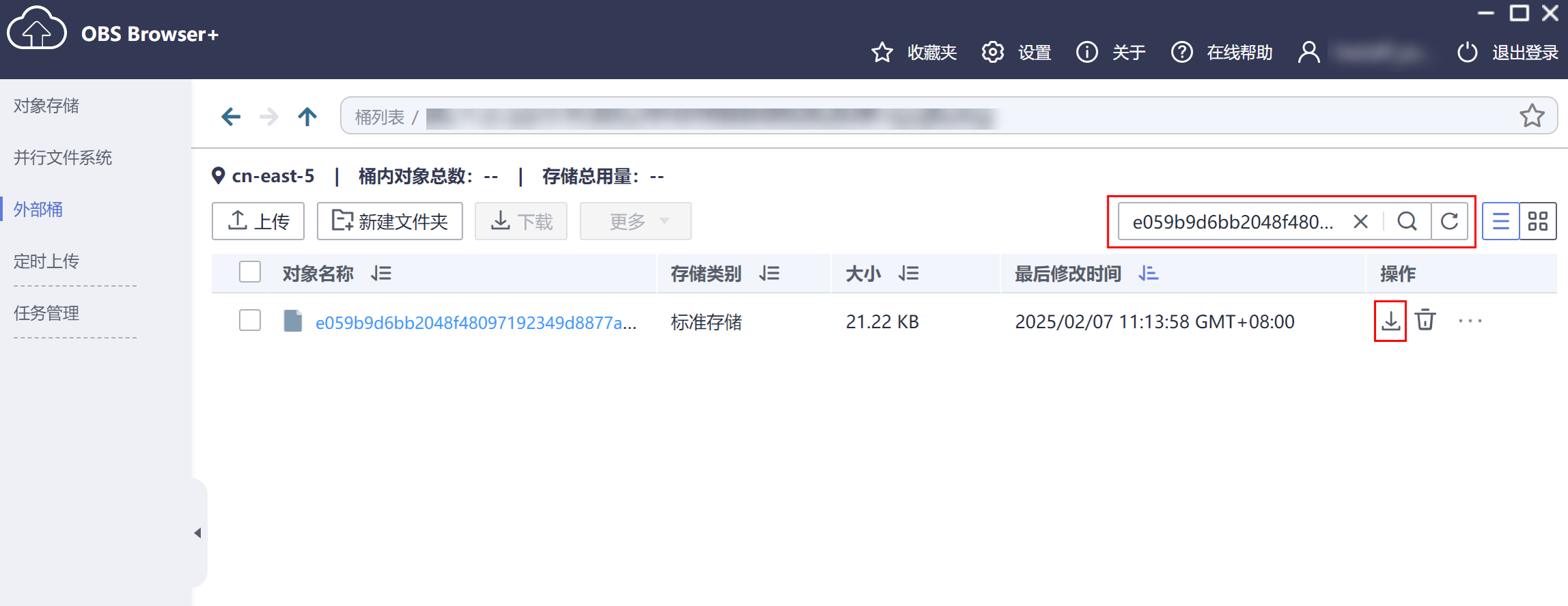 - 单击挂载成功的外部桶桶名,进入对象列表页面。在右侧搜索框,搜索4中获取的日志文件名,单击