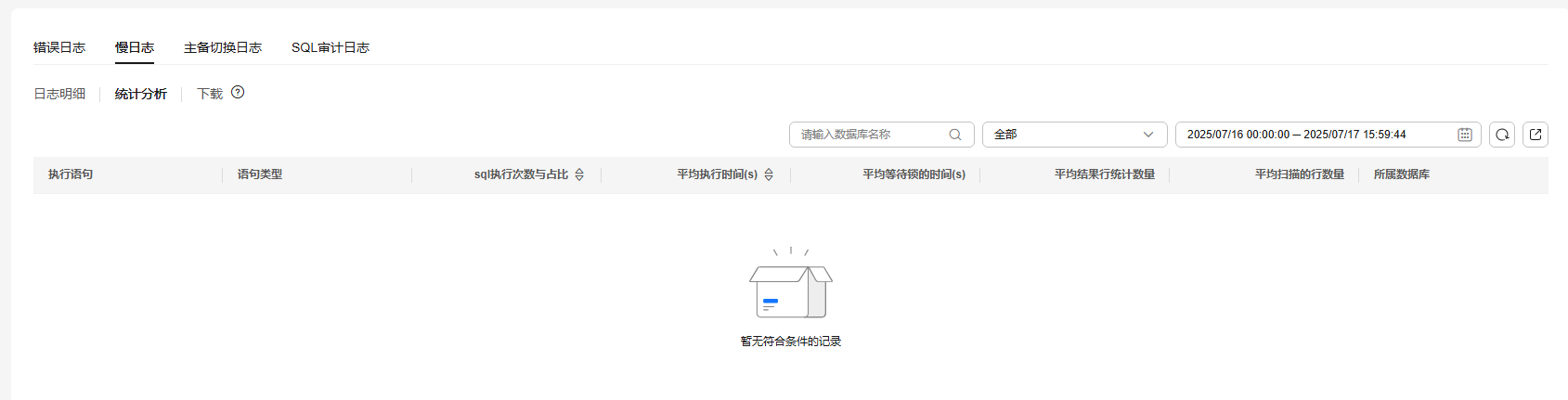 支持查看指定数据库名称(仅支持精确搜索,不能包含特殊字符)的慢日志统计分析。