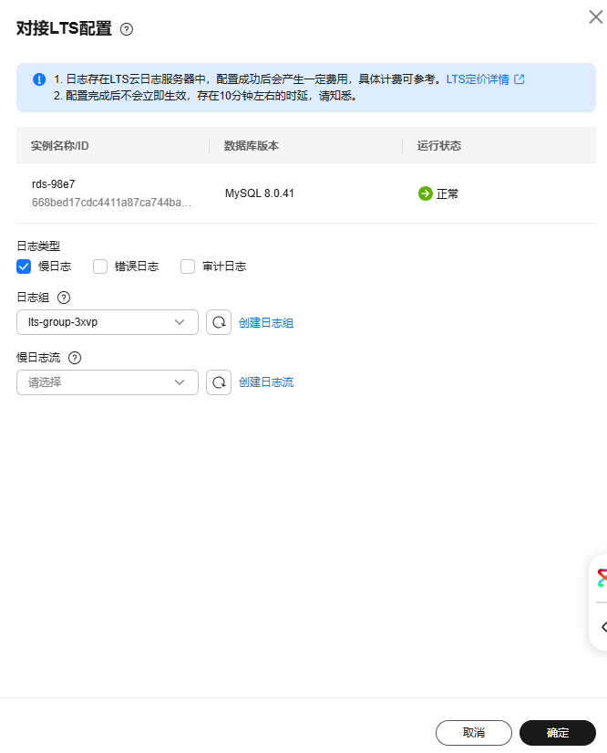 - 在右侧弹框中,日志类型选择慢日志,在下拉框分别选择对应的日志组和日志流,单击“确定”。