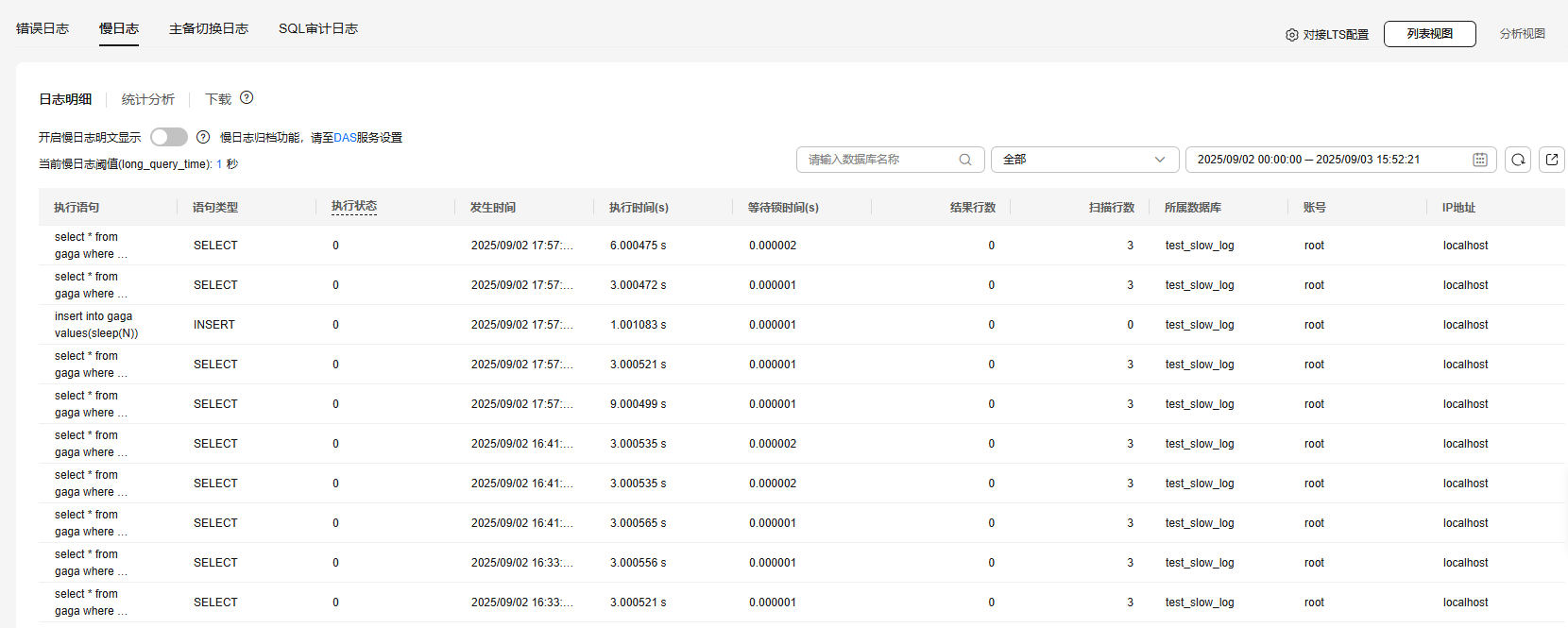 - 在“日志明细”页签下,查看指定执行语句类型或时间段的慢日志记录。