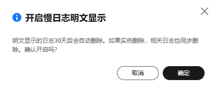 - 在弹出框中,单击“确定”,开启慢日志明文显示功能。