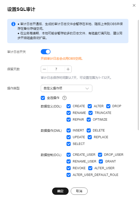 - 审计日志开通后,系统会将sql操作记录下来,生成的审计日志文件会暂存在本地,随后上传到obs并保存在备份存储空间。如果审计日志的大小超过了备份空间容量,就会按照超出的部分进行计费。