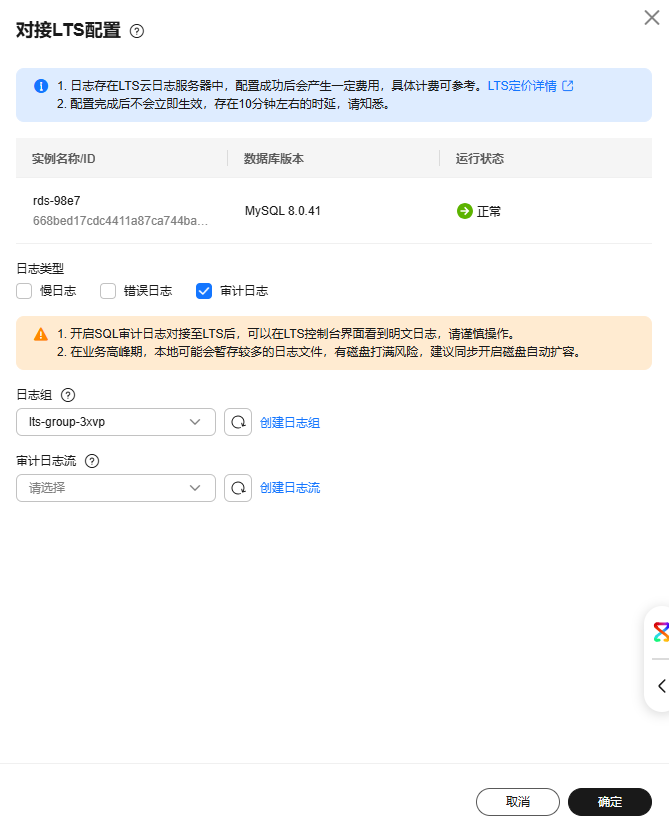 - 已开启sql审计开关,此时再开启lts审计日志,出于对实例的正常运行考虑,建议保留原有审计策略一段时间,待lts审计日志运转正常后,再关闭原有审计策略。