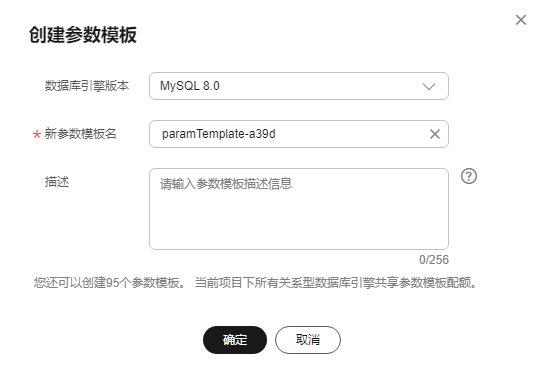 - 选择数据库引擎版本,命名参数模板并添加对该参数模板的描述,单击“确定”,创建参数模板。