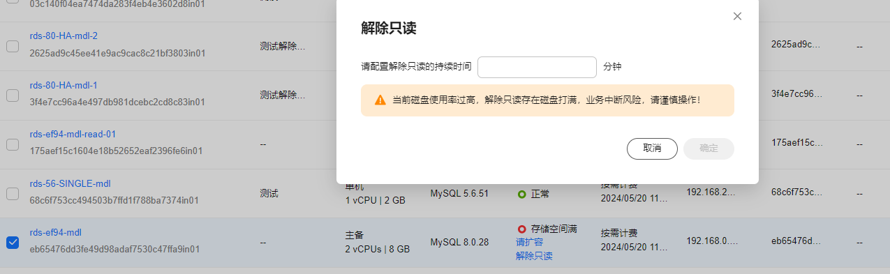 在“存储空间满”状态的实例上,单击“解除只读”,在弹框中设置解除只读的持续时间(可输入5~10分钟),单击“确定”。