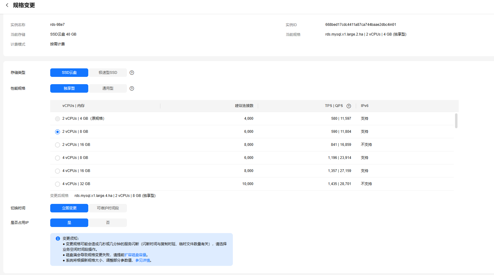 - 是:变更规格会临时占用ip,且变更后不会立即释放(默认12小时后释放)。变更规格前,请确保有未被使用的内网地址(主备实例:2个未被使用的内网地址;单机实例:1个未被使用的内网地址;只读实例:1个未被使用的内网地址),否则变更规格会失败。当前子网ip资源充足的情况下,建议使用占用ip方式进行变更。