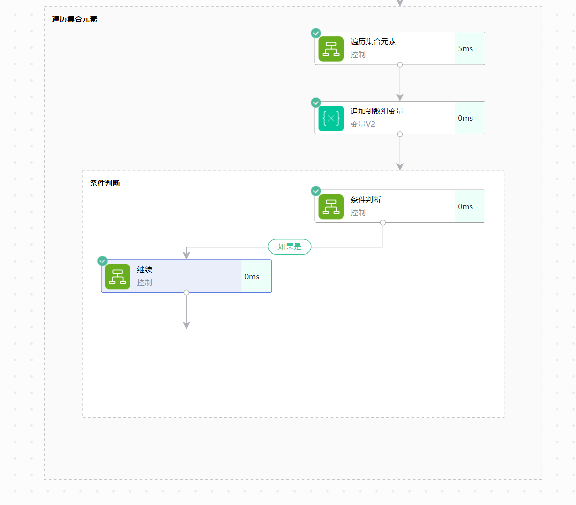 设置了继续(continue)节点后,流运行到该节点时,会跳过当前循环的后续操作,直接进入下一次循环(而非跳出整个循环)。