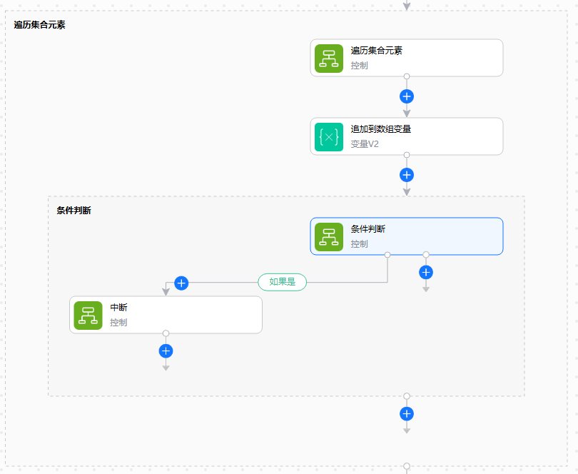 设置中断(break)节点后,流运行到该节点时会立即终止循环,不再执行循环内的后续操作。如下图所示,当条件满足触发中断节点后,将直接跳出整个循环(而非本次循环),后续循环迭代也会被终止。