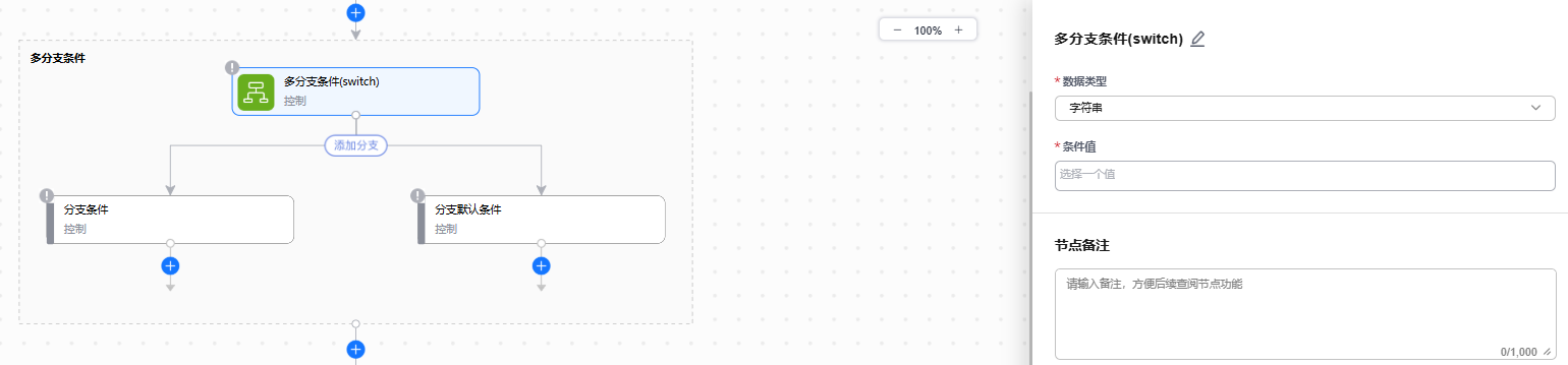 选择多分支条件后,侧边栏会展示该动作包含的参数,画布上会展示一个多分支条件的白色框,单击“添加分支”,添加业务场景所需要的各个分支条件,同时画布上会展示各个分支条件的信息,分支条件里面可以再添加其他分支。