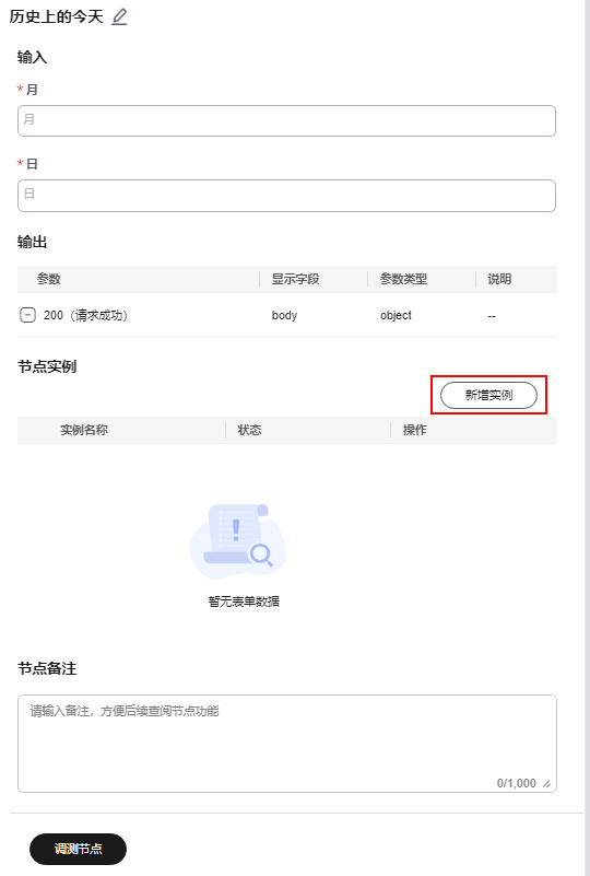 - 在工具节点的配置面板中,单击“新增实例”,此处以“历史上的今天”节点配置为例,如图2所示。