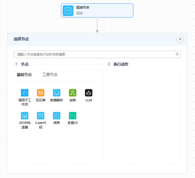 > 添加执行动作”或“添加执行动作”。 - 在弹框中选择基础节点或工具节点,选择节点的执行动作,各节点的详细介绍请参见和工作流工具节点说明。