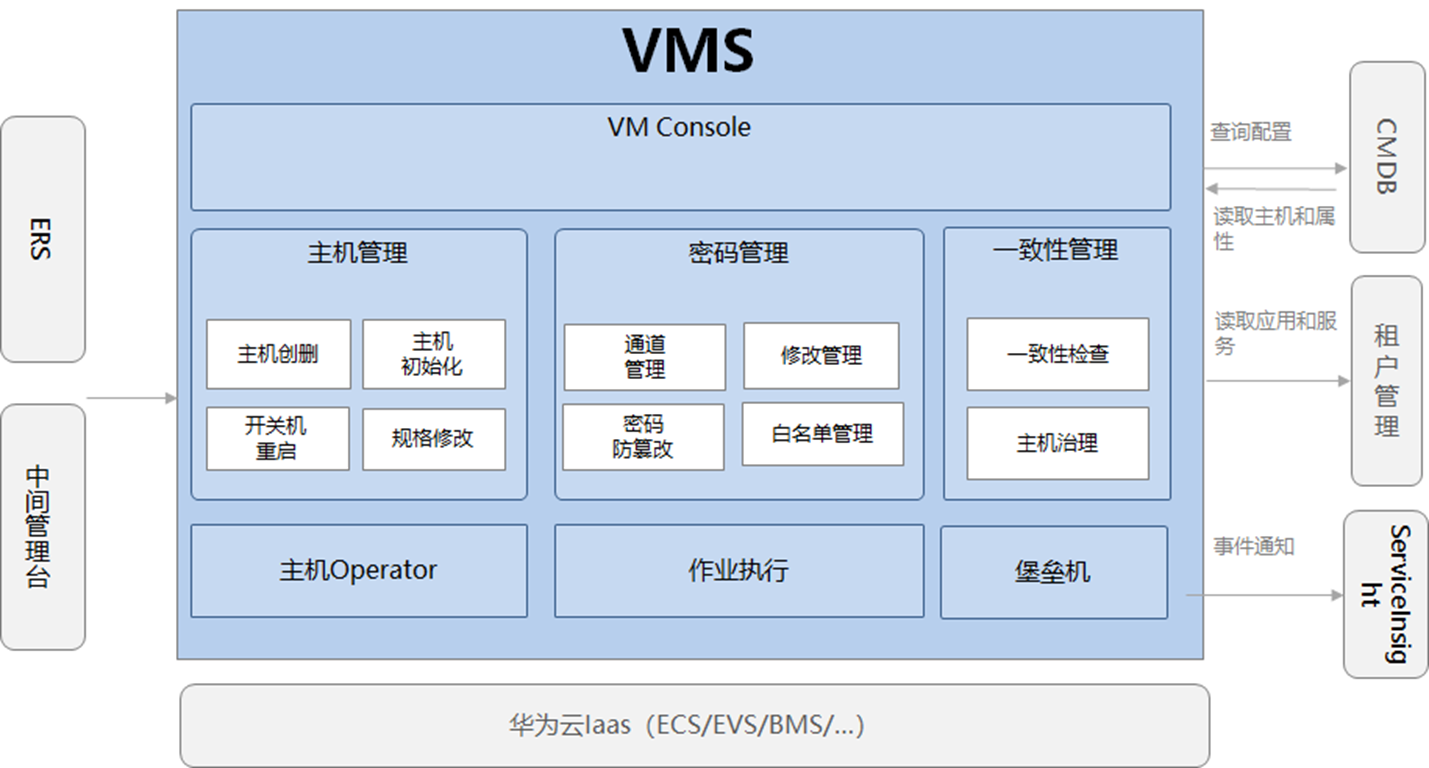 - 主机管理服务(vms):是基于云原生的主机资源管理服务,负责各种类型的主机资源发放/回收/操作、os管理、密码密钥管理。