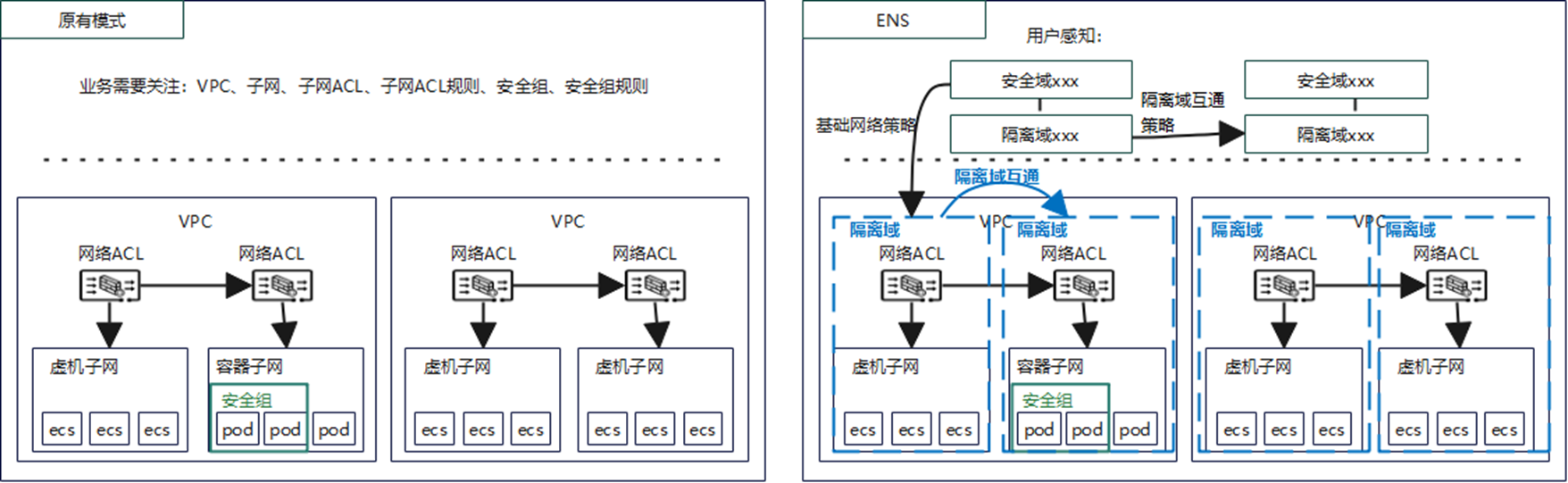 - 弹性网络服务(ens):通过引入“隔离域”这一网络资源概念,将业务使用的底层网络资源进行封装,为具有相同安全保护需求并相互信任的服务提供访问策略的安全分组。当服务器加入到隔离域后,即受到这些访问规则的保护。访问规则继承自选定的安全区域(安全域),并根据租户声明的服务依赖关系自动生成。