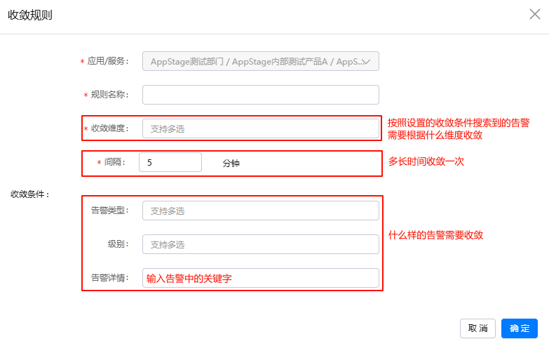配置当前告警规则的收敛条件,满足条件的告警会按照设置的收敛维度进行收敛。