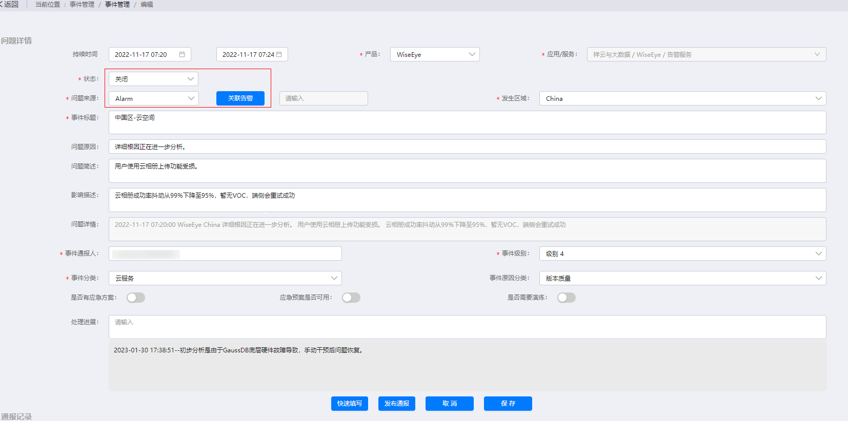 - 关闭事件关联告警,事件关闭时告警需处理完成。