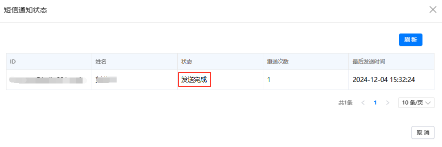 - 单击“查看状态”,可查看通知人员短信发送状态,如图1所示。