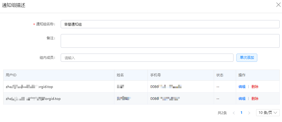 - 填写通知组名称、备注,并在组内成员后的输入框输入成员账号名,并单击“单次添加”,可重复输入并添加多个成员,如图1所示。