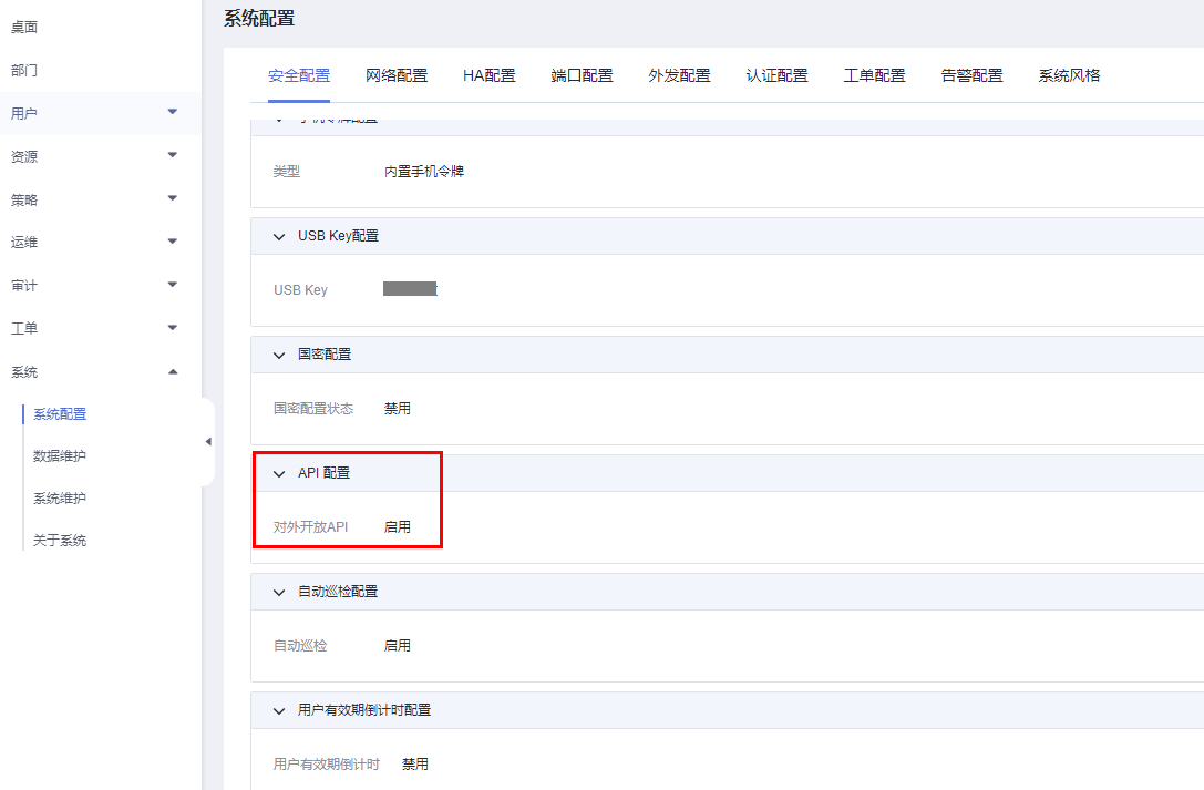 在云堡垒机系统“系统 > 系统配置 > 安全配置”页面,api配置模块开启对外开放api开关,如图1所示,具体操作请参见。