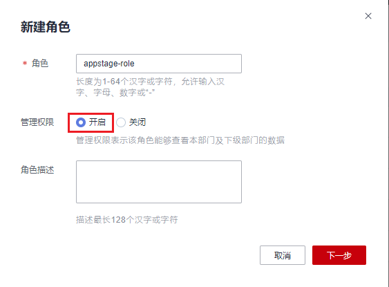 在云堡垒机系统“用户 > 角色”页面,创建appstage-role角色,并开启管理权限,如图2所示。然后配置角色权限,usbkey、动态令牌、应用服务器、应用发布和应用运维不配置,其余全部配置,如图3所示,具体操作请参见。