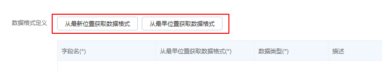 - 在编辑页面,数据格式定义中单击“从最新位置获取数据格式”或“从最早位置获取数据格式”,如图3所示。可以获取到数据结构,数据字段说明如表2所示,然后单击“确定”。